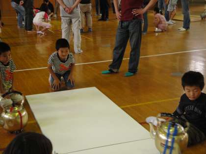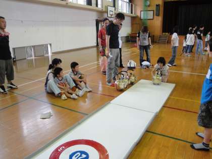 やかんの中には,セメントが入っています。一投ごとに,やかんが変わりますので,重さや形によって,速度やコースが全く違います。助走をつけて投げたり,壁による反射を利用したりと,作戦次第で勝敗が分かれます。本校教員チームも参加しましたが,残念ながら,予選突破はなりませんでした。