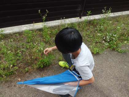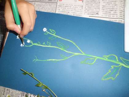 グランドの隅に生えているヒメジョオンやカラスノエンドウ,エノコログサといった野草を摘み,じっくりと観ながら水彩絵の具を使って描きました。