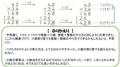 5年生は,算数科で「小数のかけ算」に取り組んでいます。整数×小数や同じ位同士の小数のかけ算には慣れてきたようですが,今回学習したパターンには,ずいぶん頭をひねっていました。