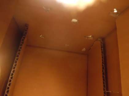 用意した箱に1か所だけ穴を開け,どんな世界ができそうかを想像しました。そして,テープやアルミホイルなど色々な材料を用いたり,段ボールカッターや錐などの道具を使ったりして制作に取り組んでいきました。