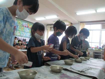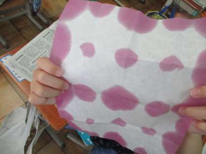 生活科で育てている朝顔の花をたくさん集めて色水遊びをしました。和紙を丁寧に折って,和紙の角に色水をつけました。ゆっくりゆっくり開けてみると,「わあ!きれいな模様になってる!!」と大歓声。一人一人違う素敵な模様ができました。