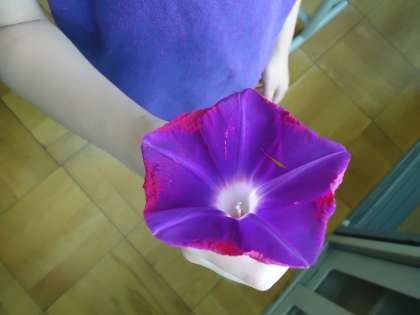 紫の色の花に 赤色が 混ざった 花が 咲きました。淵が 赤くなっています。