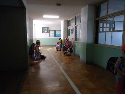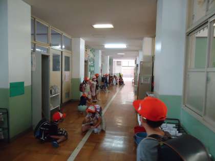 1学期から 1年生の 集団下校をしています。 教室の前の廊下に並び出発しています。子どもたち同士で 集まり,先生に確認してもらってから 下校しています。1学期よりも とても 上手になりました。