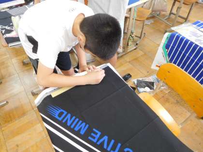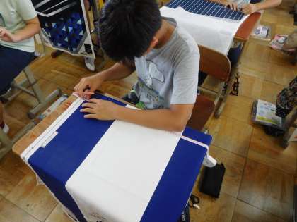 エプロンに線を引いています。生地の上に線を引くので引きにくいようです。悪戦苦闘でした。