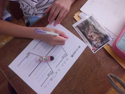 先生が一人一人に配ったアートカードに載っている美術作品を鑑賞して「どんなタイトルをつけるのか」をじっくり考えました。