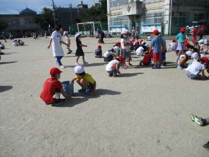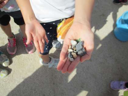学校でみんなで力を合わせて石拾いや草引きをしました。