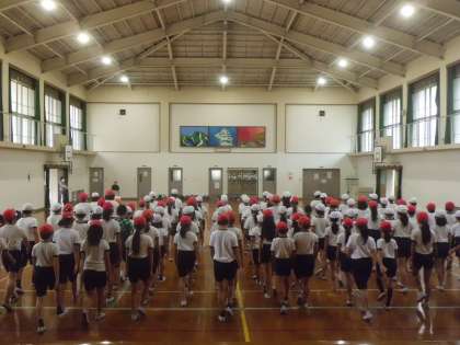 「よっしゃ,今日も練習するで!」と,勇んでいた5年生たちでしたが,気持ちを切り替えて体育館で全員リレーの行進・退場練習に取り組みました。