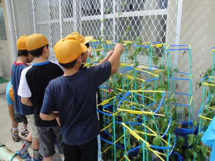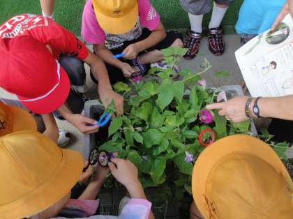 花壇に集まり,虫めがねを使ってアサガオの花のつくりを観察しました。