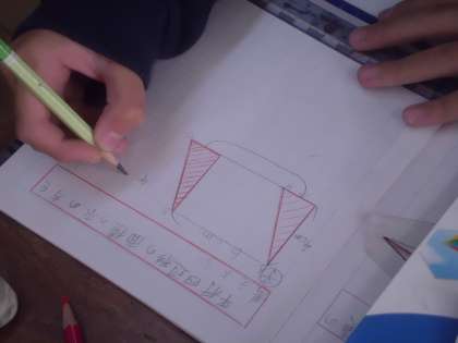 「四角形の仲間やし,長方形と同じでええんちゃうかー?」「いや,よう見たら三角形があるし,三角形の面積の公式を使うんちゃうかな?」「〜さんは,そう言ったけど,四角形で÷2は使えないですが・・」など,さかんな話し合いが行われました。