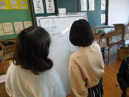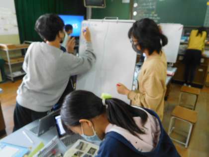 タブレットで調べた土地の変化について,ホワイトボードにまとめました。