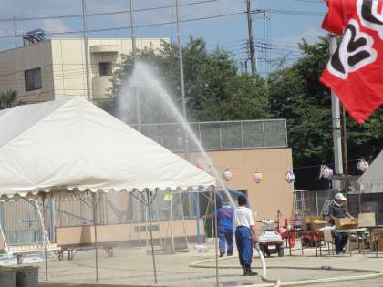 午後2時過ぎ。消防団の方が,砂煙防止のため,運動場に放水されていました。