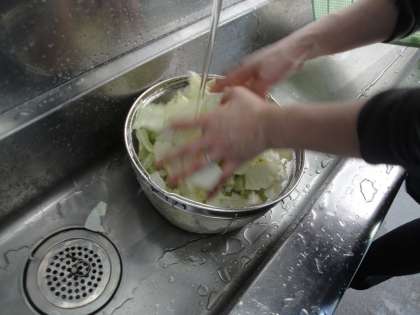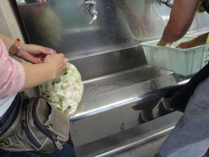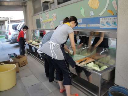 給食室前では,PTAのみなさんが,やきそばの仕込みをしておられました。