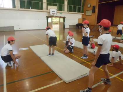 5年生は,体育科「マット運動」に取り組んできました。苦手な技や連続技に挑戦しています。