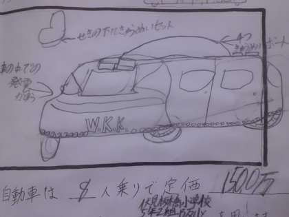 社会科「自動車をつくる工業」を学習してきた5年生。学習の最後には,自分が考える世界に1つだけの自動車を考えました。