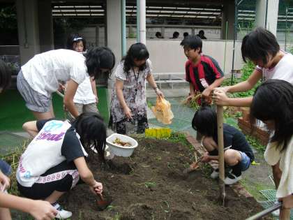 今日は,3クラスから4人ずつ花壇に集合して,ジャガイモの収穫をしました。