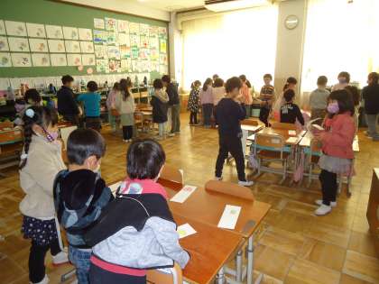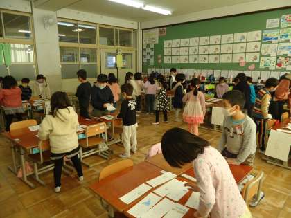 お店(ひとまとまりの名前)を決めて,カードに品物を{一つ一つの名前)と絵を描きました。そのカードを並べて,お客さんとお店の人に交代でしました。