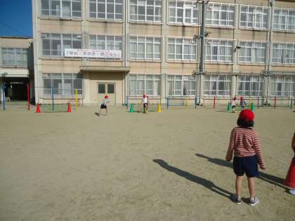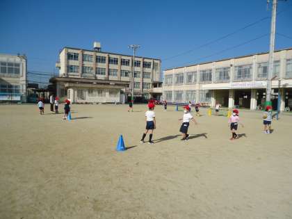 「ボールけりゲーム」を始めました。足の内側で蹴る練習です。パスするのに,一生懸命です。きょうは,二人組で,パスし合いながら,最後にシュートです。思うようにボールが転がらず,子どもたちは,頑張っていました。きょうの日差しは,柔らかく子どもたちを温めていました。良いお天気でした。