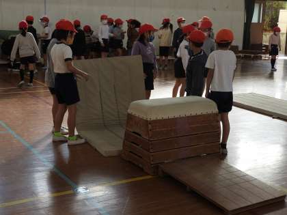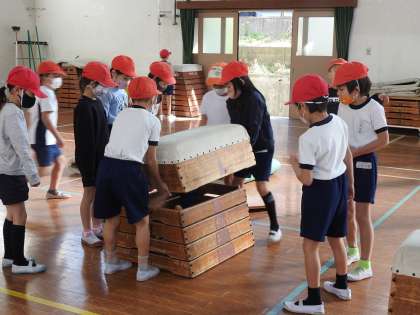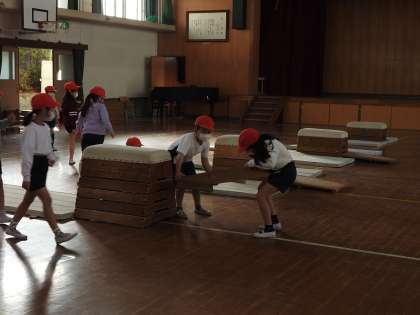 体育のとび箱のじゅんび,子どもたちがやっています。