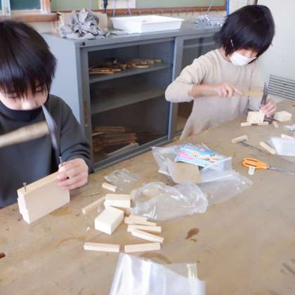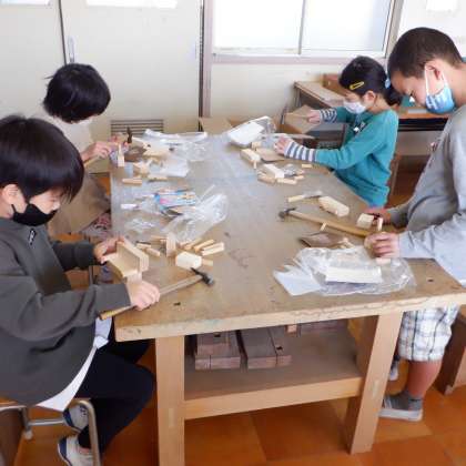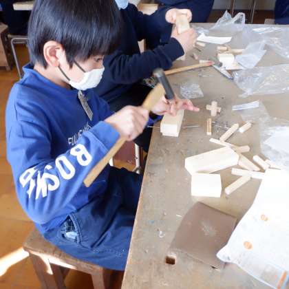 リズムよく釘を打っていき,自分の作りたいイメージをどんどん広げて作品を作っていました。