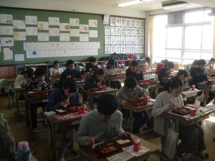 「中学校で給食か弁当か迷うなぁ。」などいろいろな声がありました。普段とは違うメニューで新鮮な様子でした。