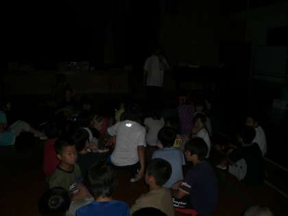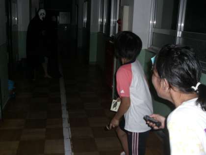 8時半,体育館で教頭先生の『こわ〜い話 学校編』を聞いた後,校舎内の肝試しに行きました。1番に出発したグループも怖かったでしょうが,中程で出発したグループは,「キャ〜!」
