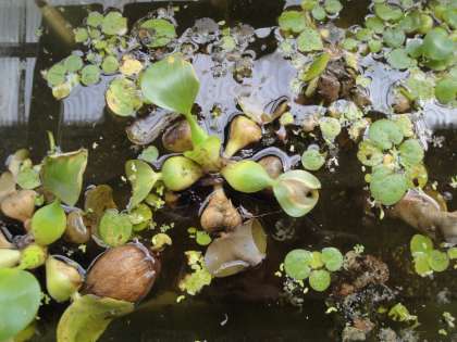 北校舎と西校舎1階渡り廊下の水槽に,メダカがいます。本館前のメダカの学校から引っ越して来ました。広い水槽を気持ちよさそうに泳いでいます。そうっと覗いてみてください。