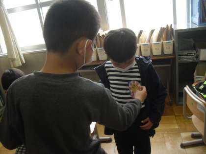 「また一緒に遊ぼうね。」と,メダルをつけてあげています。