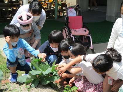 学校の花壇にキャベツを植えています。