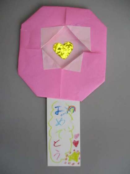 さあ,きょうは おむかえしゅうかいです。きょうの ために 2ねんせいが てづくりの おはなのかざりを つくってくれました。なふだに さしこむと むねに ぴったりとつきます。ひとりに ひとつずつあるよと いうと 「えー!」とおおよろこび。むねに つけて さあ じゅんびは おっけーですね。