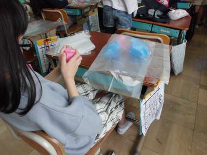 新聞紙・毛糸・お花紙・包装紙・タオル…様々な素材を袋に入れて,