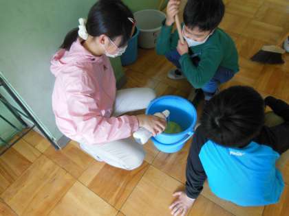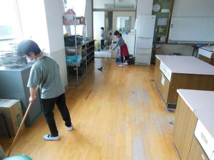 特別教室の掃除や,消毒液を使ってドアの取っ手などの共用部分の消毒もします。