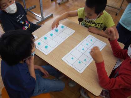 実際に10の部屋にふわふわボールを並べて、どちらが何個多いか比べました。