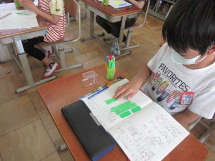 「17+4」は,いくつになるのかを 数え棒を使って考えているところです。「17+3が20になるから・・・」と昨日の学習を使って考えています。