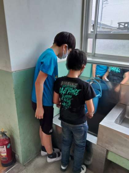 「バケツはこっちやで。」と,手を引いて案内し,「この線まで入れるんだよ。」と優しく教える6年生のすがたが見られました!
