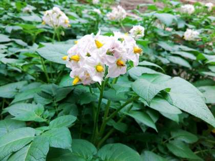 よく見ると,花が咲いています。ジャガイモはスーパーや八百屋,冷蔵庫で見る機会はあっても花を見るのは,なかなか珍しいものです。