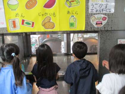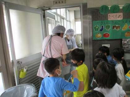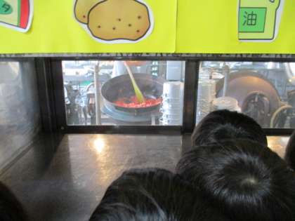 きゅうしょくしつでは,たのしみにしていた おおきなおなべや おおきなしゃもじを みることができました。おおきな おなべで おにくを いためているところや もやしを ゆがいているところを みることができて みんな だいまんぞく。「きゅうしょくしつと なかよくなれたよ。」ときょうしつに かえってきました。