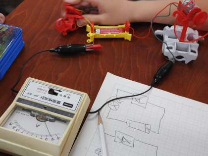 そこで,電気の流れる向きを確かめるために,かんいけん電流計を使いました。