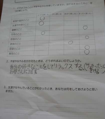 不安や悩みをかかえたときの対処にはいろいろな方法があり,自分に合った対処法があることについて理解したことを書いたり,話し合ったりしました。