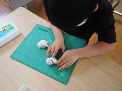 手のひらや指先をいっぱい使って、ひものように細長くしたり,小さな丸の形をつくったりしました。へらを使って小さく刻んだり…いろいろな形を使って野菜やお皿などを作っていきました。