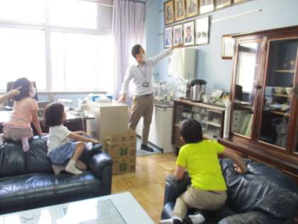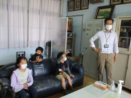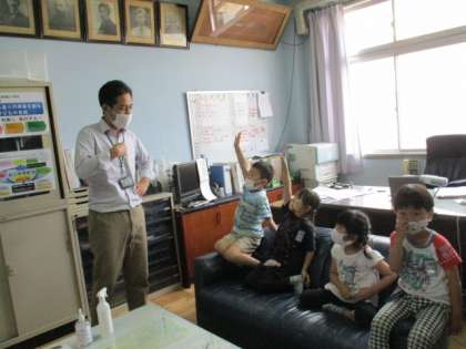 がっこうたんけんの さいごに こうちょうしつへ いきました。みんなが だいすきな こうちょうせんせいのへやにいれてもらい そふぁに すわらせてもらって いろいろな おはなしをききました。「どんな おしごとを しているのですか。」「しごとは たのしいですか。」「どんな しごとが たのしいですか。」とたくさんしつもんしていましたね。これで こうちょうせんせいとも なかよしに なれましたね。