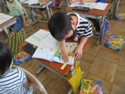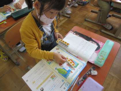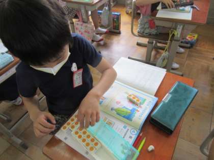 算数では,「長さ」の学に入りました。ブロックを使って,いくつ分になるかを調べたり,紙のものさしで測ったりしました。
