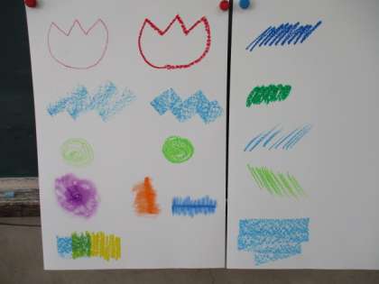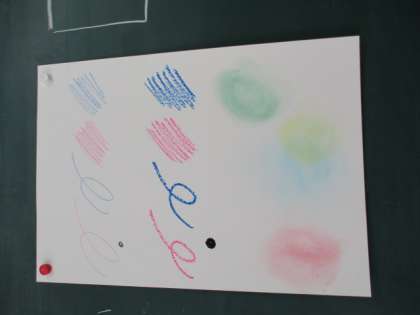 さいしょに パスやクーピーやコンテでかくと どんなふうになるかを がくしゅうしました。