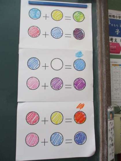 そのなかで いろをまぜると ちがういろができることを はっけんし それぞれのクラスで いろの たしざんをして あたらしいいろの はっけんをしました。