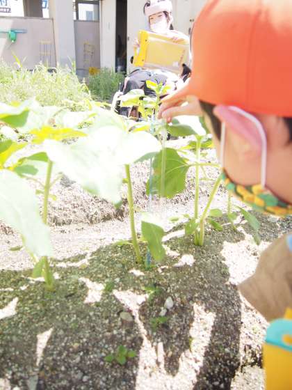 ひまわり学級で育てているズッキーニときゅうり,ひまわりがどんどん大きくなっています。草丈や葉っぱの形を観察しました。