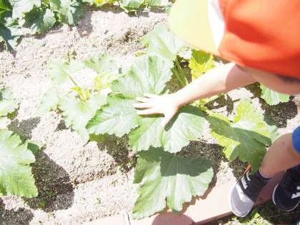 「手より大きいなぁー」「ズッキーニの葉っぱは顔より大きいなぁ」と比べながら表していました。