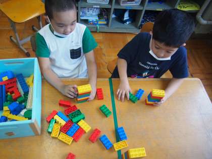 ブロックを見せないようにして「何番目」を聞いてブロックを積み重ねました。