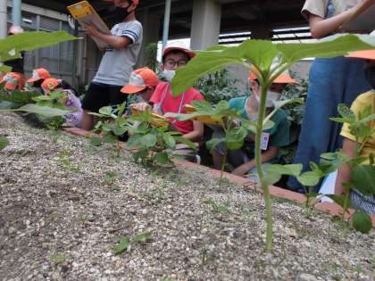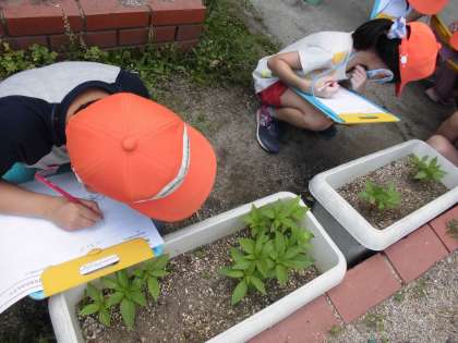 子葉の様子を観察してから数日間が経ち,大分大きく育ってきたので,一度「ダイズ」「オクラ」「ホウセンカ」「ヒマワリ」の観察を行いました。