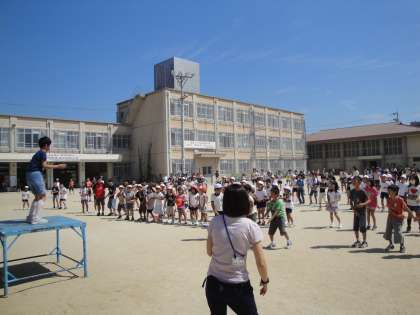 中間休み,運動会の全校体操の練習を運動場で行いました。お手本の全校演技・準備運動係の児童を見て,一生懸命に体を動かしました。