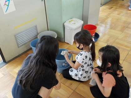 中には,1年生の目線に合わせて,そうじの方法を教えている人も・・!“相手意識”が身についている証拠ですね!