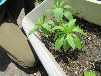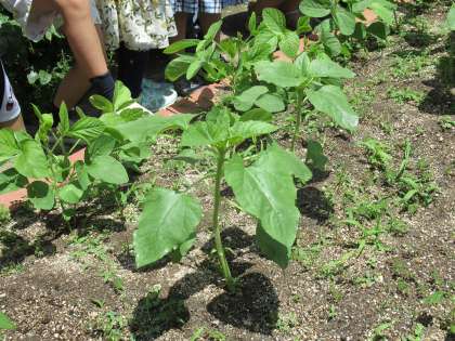 オクラ,ホウセンカ,ダイズ,ヒマワリの観察をしています。